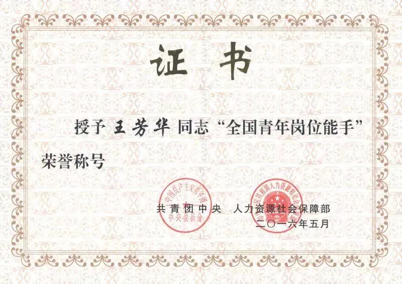 2016年“全国青年岗位能手”荣誉称号