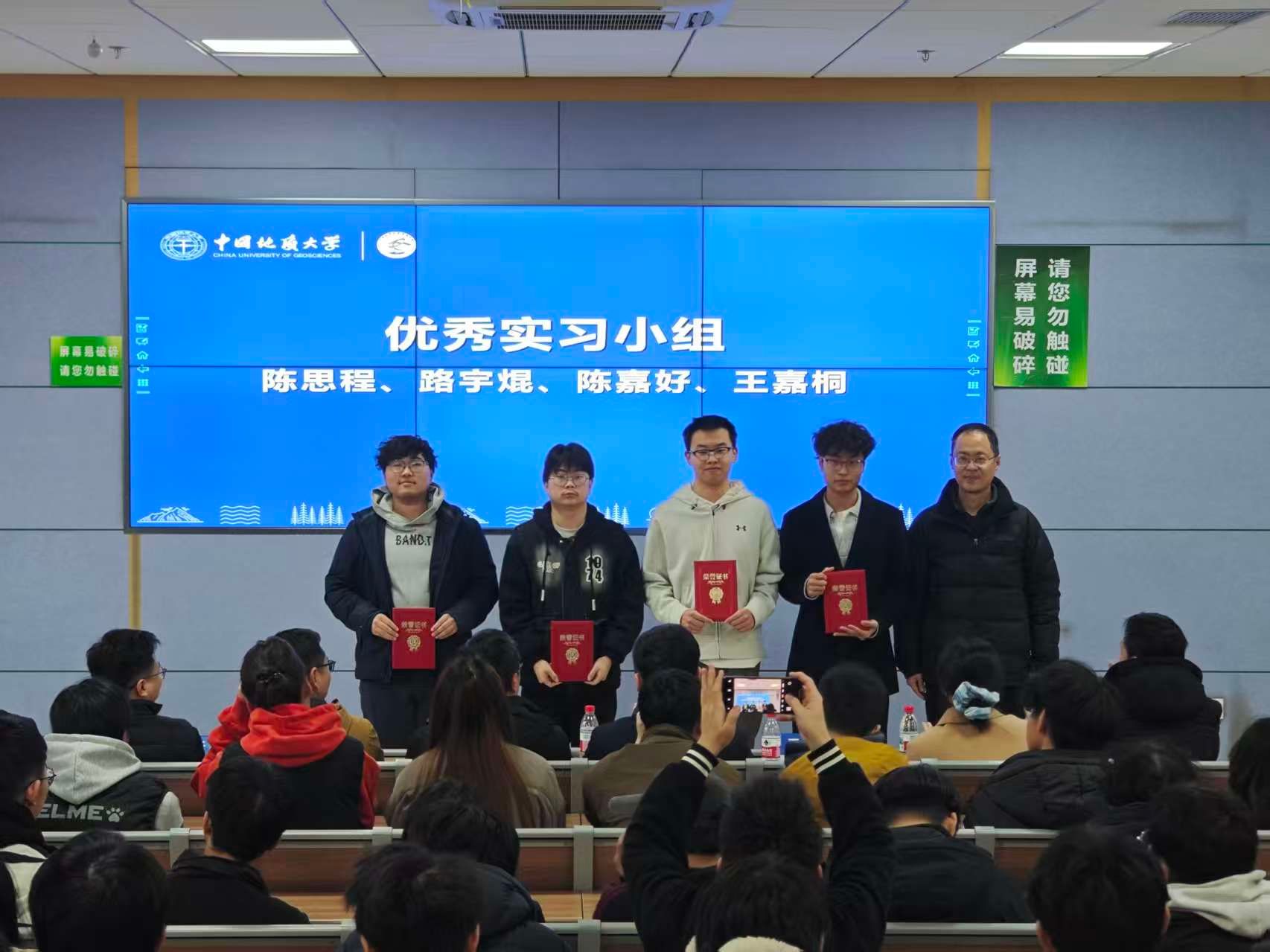 严哲为优秀实习小组颁发证书。